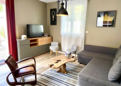 Elle dispose d’un salon-séjour et d’une cuisine aménagée et entièrement équipée (four, frigo-congélateur, lave-vaisselle, micro-ondes, four, cafetière à filtre, grille-pain, Nespresso, bouilloire, micro-ondes, plaque vitrocéramique, toute la vaisselle nécessaire, une télévision (chaînes TNT), sèche-cheveux, machine à laver, table et fer à repasser).